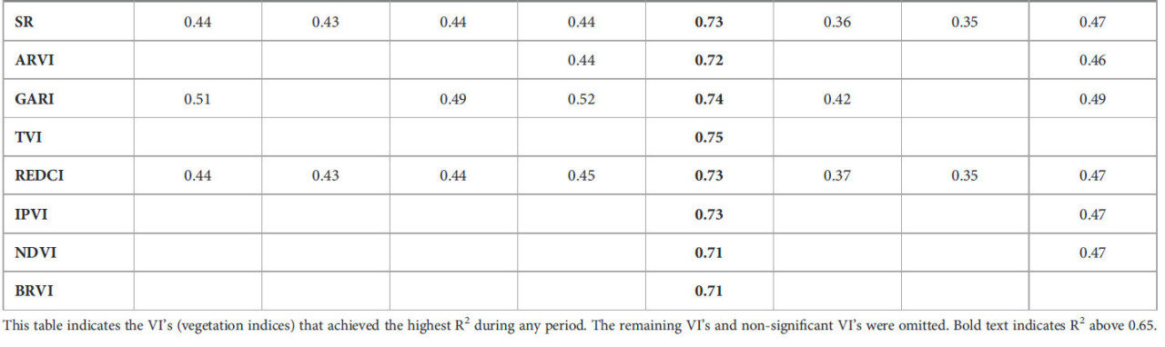Эта таблица показывает VI (вегетационные индексы), которые достигли наивысшего R² в любой данный период. Остальные VI и незначимые VI опущены. Жирный текст указывает на R² выше 0,45.