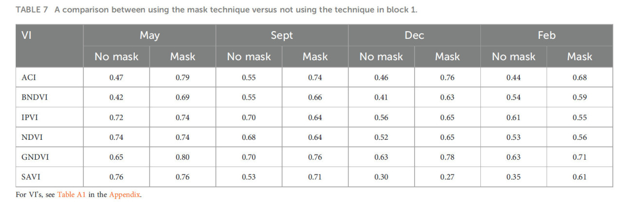 Метод маски использовался для устранения спектральных помех от других покрытий, таких как растительность на почве, тени, почва, подлесок (более применимо к разреженным деревьям, очевидным в блоке 1) и т.д. Было проведено сравнение между корреляциями VI, рассчитанными с использованием метода маски и без использования маски для блока 1 (Таблица 7). Меньше различий произошло в феврале (влажный сезон, выпало 13 см осадков), в то время как более высокие различия произошли в декабре (влажный сезон) и мае (сухой сезон, почти без осадков). За исключением SAVI, где самые высокие различия были в феврале и сентябре. Результаты VI из анализа «без маски» в целом были хуже, чем те, которые использовали маску (Таблица 7). Возможно, немного меньшую разницу в IPVI можно объяснить тем, что IPVI включает атмосферную и почвенную коррекции (Huete et al., 1999). GNDVI и NDVI также имели очень маленькие различия, в то время как ACI и BNDVI имели самые большие различия. В заключение, эффект метода маски был невелик: почва и растительность на почве, по-видимому, не оказали большого влияния на индекс в случае отсутствия маски. Однако присутствуют тонкие различия, и они могли способствовать благоприятным результатам высоких корреляций.