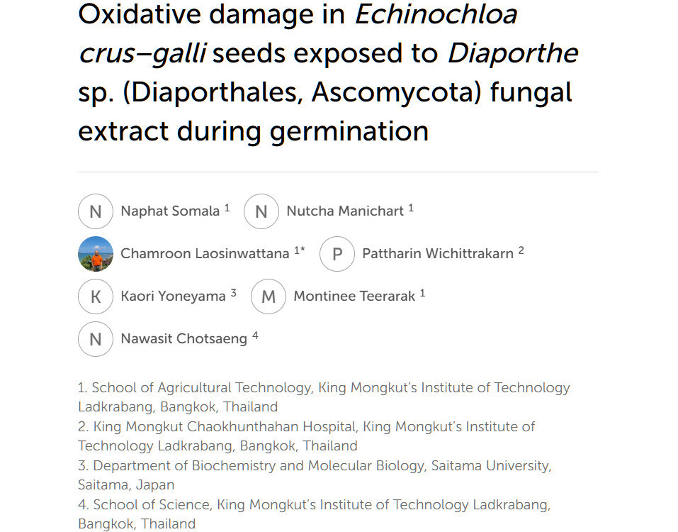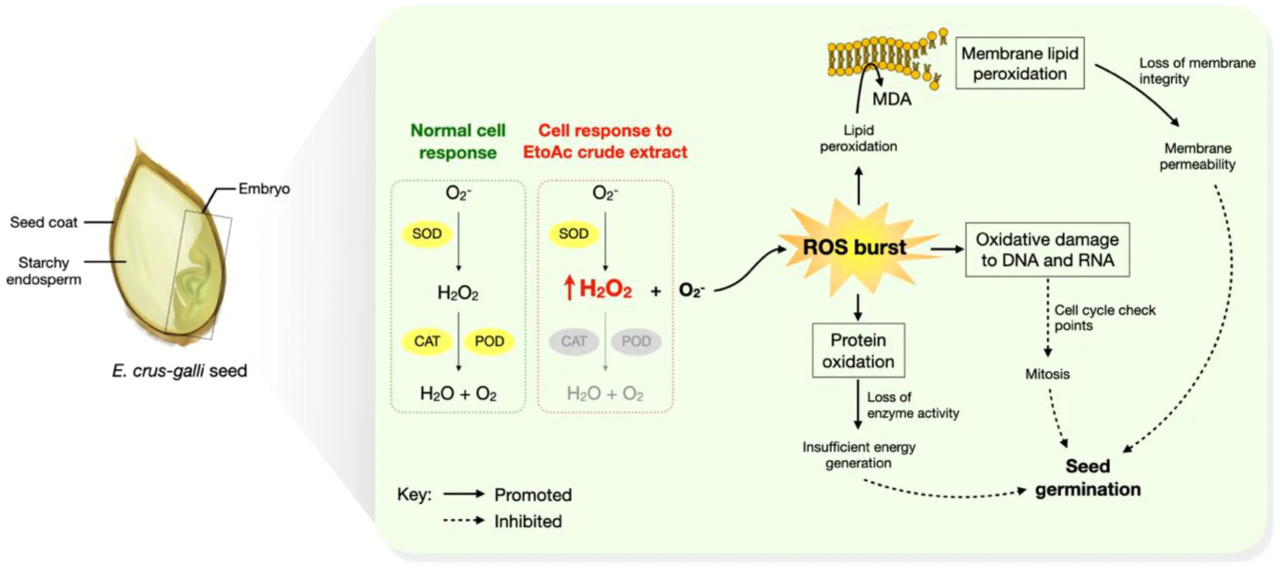 Somala N, Manichart N, Laosinwattana C, Wichittrakarn P, Yoneyama K, Teerarak M and Chotsaeng N (2024) Oxidative damage in Echinochloa crus−galli seeds exposed to Diaporthe sp. (Diaporthales, Ascomycota) fungal extract during germination. Front. Agron. 6:1456168. doi: 10.3389/fagro.2024.1456168