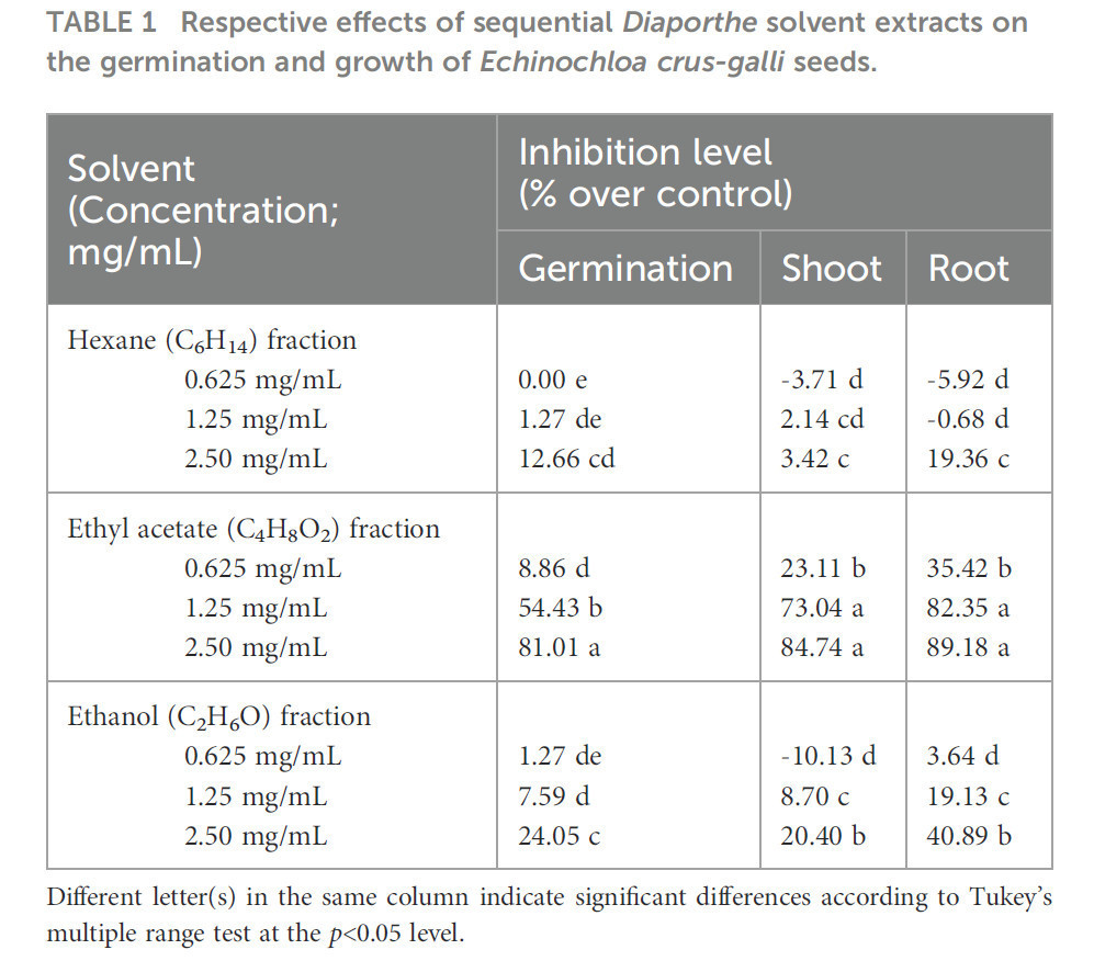 Таблица 1 Соответствующие эффекты последовательных растворительных экстрактов Diaporthe на прорастание и рост семян Echinochloa crus-galli.