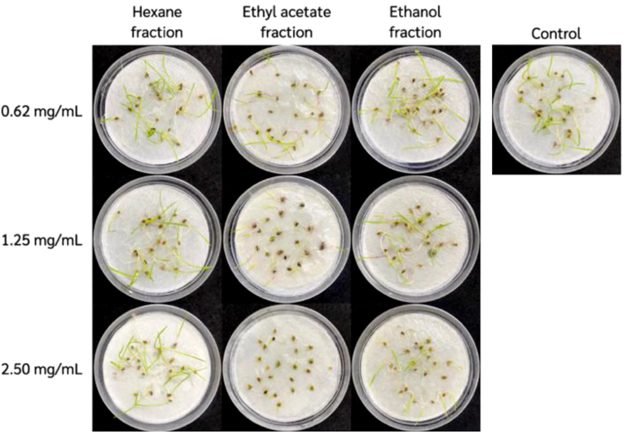 Во-первых, каждый сырой экстракт липкого гриба растворяли в соответствующем растворителе (гексан, EtOAc или EtOH) в концентрациях 0,625, 1,25 и 2,50 мг/мл. Концентрации были выбраны на основе предварительных экспериментов, которые показали, что эти концентрации влияют на прорастание семян. Поддерживали четыре повторности на обработку для каждого из органических растворителей в полностью рандомизированном дизайне (ПРД); обработки дистиллированной водой использовали в качестве отрицательных контролей. Для тестов на прорастание, согласно Teerarak, Laosinwattana (Teerarak et al., 2010), 5 мл каждого раствора экстракта добавляли в чашку Петри (диаметром 9 см), содержащую двойной слой бумаги для проращивания, и оставляли испаряться до полного высыхания при комнатной температуре. Затем бумагу для проращивания в чашке Петри увлажняли 5 мл дистиллированной воды. Двадцать здоровых семян ежовника помещали в каждую чашку. Чашки помещали в климатическую камеру (LAC-1075-N, Longyue, Шанхай) с температурой 27 ± 2°C, фотопериодом 12/12 ч свет/темнота и относительной влажностью около 80%. Скорость прорастания семян сорняка и длину корней и побегов проростков (см) оценивали через семь дней обработки. Оптимальную сырую фракцию с наиболее высокой ингибирующей эффективностью в отношении прорастания и роста проростков отобрали для дальнейших экспериментов.