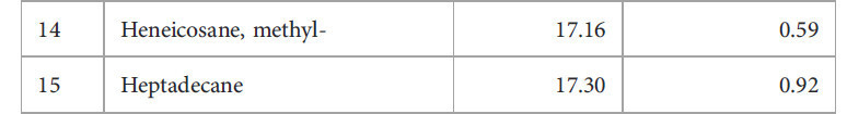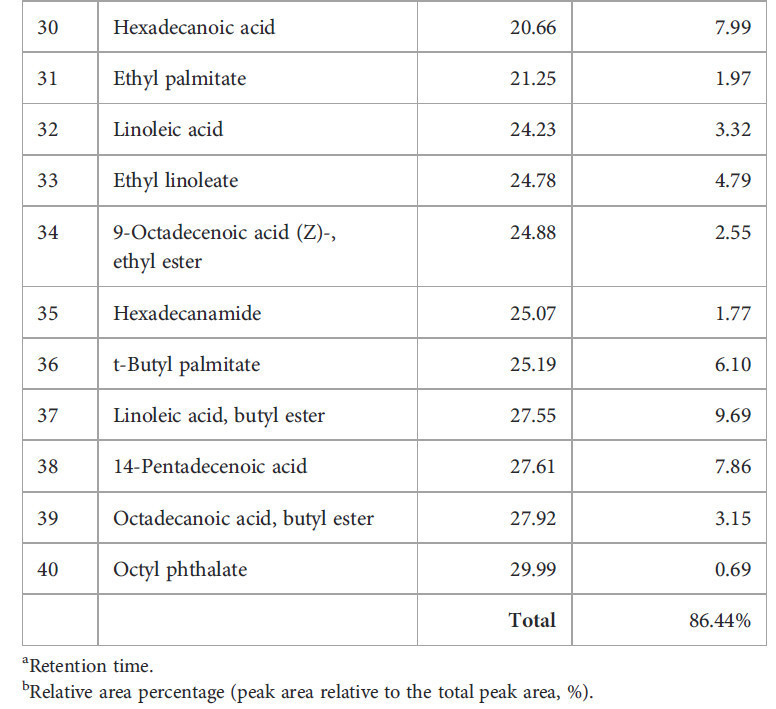 В таблице 2 перечислены химические компоненты, идентифицированные с помощью ГХ-МС в сыром экстракте мицелия Diaporthe в EtOAc. Этот анализ показал, что экстракт содержит множество фитосоединений (Рисунок 2), причем 40 идентифицированных компонентов в совокупности составляли 86,44% от общего сырого экстракта. Основными компонентами (Рисунок 3) были линолевая кислота, бутиловый эфир (9,69%), гексадеценовая кислота (7,99%) и 14-пентадеценовая кислота (7,86%). Эти результаты согласуются с предыдущими сообщениями da Rosa, Sauzem (da Rosa et al., 2021) и dos Reis, da Rosa (dos Reis et al., 2019), которые нашли сложные эфиры жирных кислот и диазосоединения в качестве основных химических компонентов экстрактов Diaporthe schini. Примечательно, что специфические активности метаболических ферментов (Winter et al., 2011; Tanapichatsakul et al., 2019) и видовое разнообразие могут приводить к дифференциации химических компонентов. Фитотоксичность, наблюдаемая в этом исследовании, может быть связана с этими идентифицированными химическими веществами и возможным синергизмом между ними.