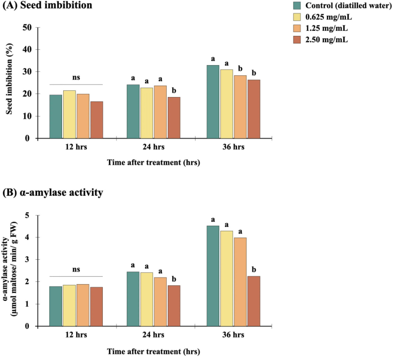 Рисунок 3 Влияние сырого экстракта Diaporthe sp. в EtOAc на набухание (A) и активность α-амилазы (B) семян E. crus-galli. Для данного времени воздействия столбцы с разными буквами (a, b) между обработками значительно различаются при p<0,05 согласно множественному ранговому критерию Тьюки. «ns» указывает на отсутствие значимого различия. Данные представляют собой средние значения (n=4).