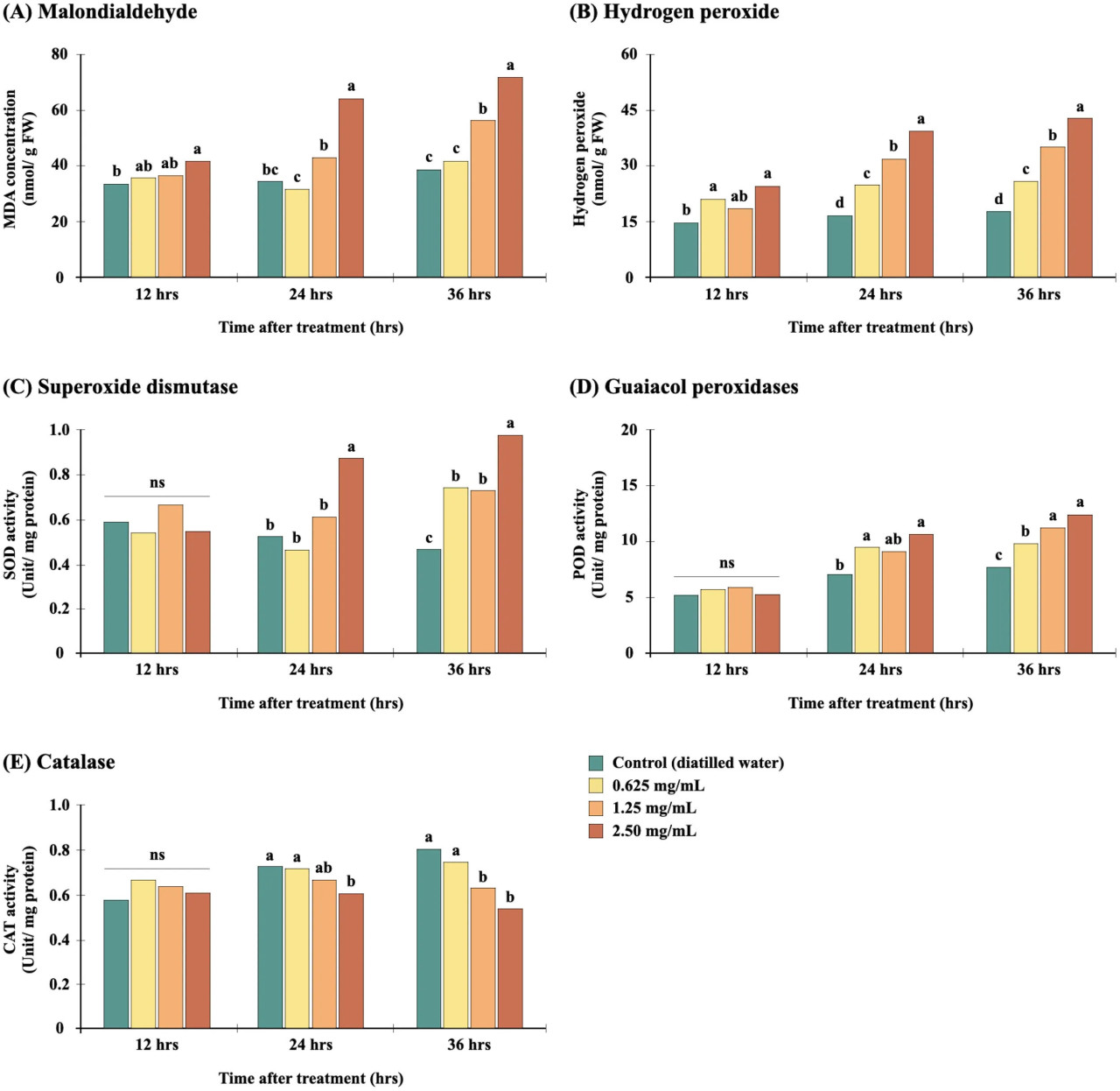 Рисунок 4 Влияние сырого экстракта Diaporthe sp. в EtOAc на содержание MDA (A) и H2O2 (B) и активность СОД (C), ПО (D) и КАТ (E) в E. crus-galli. Для данного времени воздействия разные буквы (a, b) над столбцами указывают на значительные различия при p<0,05. «ns» указывает на отсутствие значимого различия. Данные представляют собой средние значения (n=4).