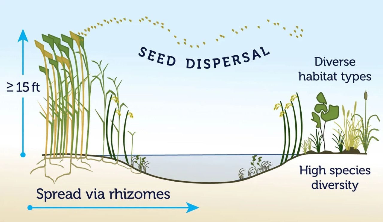 Тростник обыкновенный (Phragmites) на самом деле является исконным видом в Соединенных Штатах , но его аборигенная форма составляет лишь незначительную часть высокогорных болот – зоны, которая обычно находится над водой. Новая генетическая разновидность появилась много десятилетий назад и вторглась в солоноватые болота.