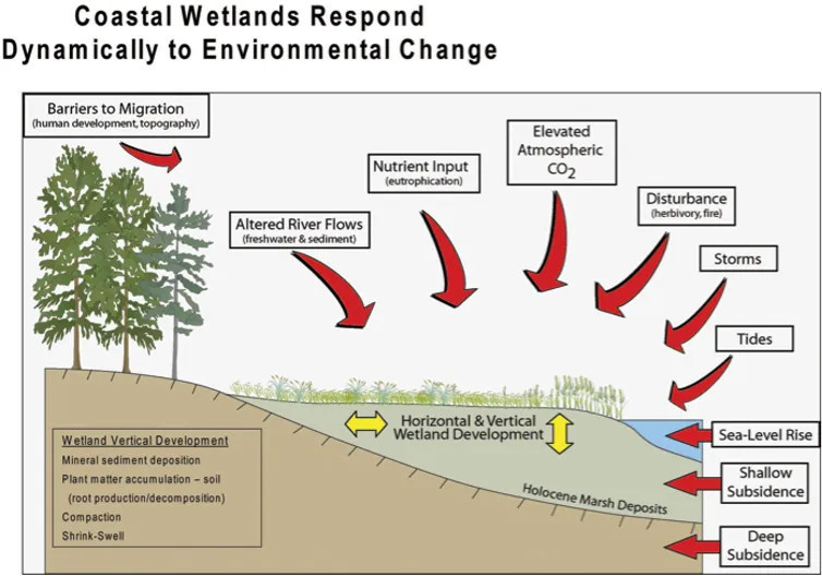 Приливные болота в Новой Англии и Среднеатлантическом регионе очень уязвимы к повышению уровня моря . Многие из них не поднимаются достаточно быстро, чтобы успевать за этим ростом, и рискуют быть затопленными, если не смогут подняться быстрее или переместиться вглубь суши. А когда крутые склоны, дома или дороги расположены ближе к берегу, болото не может переместиться вглубь материка.