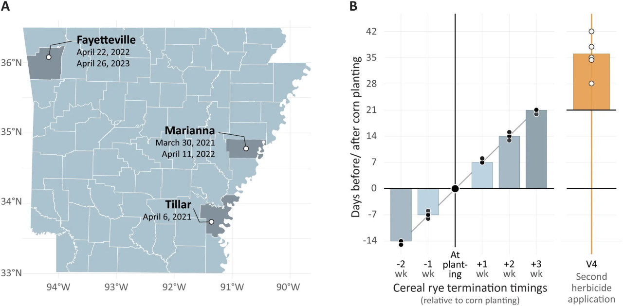 Рисунок 1 Карта, показывающая пять экспериментальных локаций-лет в Арканзасе, США, с 2021 по 2023 год с датами посадки кукурузы для каждого локации-года (A), и сроки прекращения вегетации озимой ржи (черные кружки представляют отдельный локацию-год) относительно посадки кукурузы вместе со сроками второго внесения гербицида на стадии V4 кукурузы (B). Примечание: некоторая вариабельность во времени внесения гербицида на стадии V4 кукурузы.