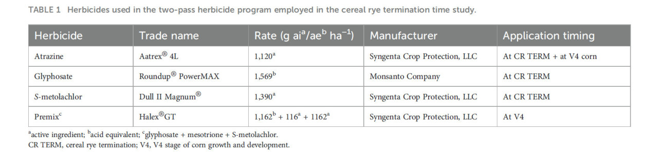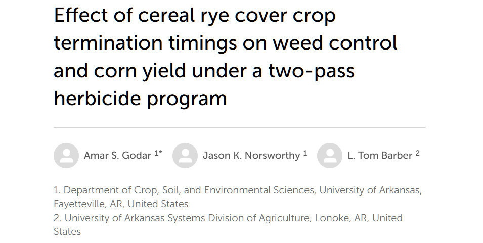 Godar AS, Norsworthy JK and Barber LT (2024) Effect of cereal rye cover crop termination timings on weed control and corn yield under a two-pass herbicide program. Front. Agron. 6:1419228. doi: 10.3389/fagro.2024.1419228