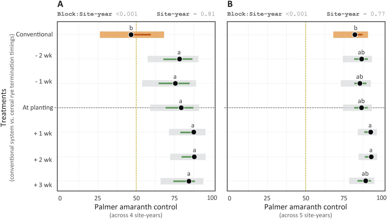 Рисунок 2 Борьба с щирицей Пальмера на стадии V4 кукурузы (A) и через 4 недели после стадии V4 кукурузы (B) в среде с покровной рожью, прекращенной в разные сроки, и в обычной системе кукурузы. Борьба с сорняками основана на шкале от 0 (отсутствие борьбы) до 100% (полная борьба). Светлые широкие полосы обозначают 95% доверительный интервал (CI) оценочных маржинальных средних, кружок представляет среднее значение. Неперекрывающиеся узкие сплошные полосы в пределах соответствующих CI указывают на значительно различающиеся средние значения. Кроме того, средние значения со сходными буквами не отличаются друг от друга. Случайные эффекты, оцененные на двух иерархических уровнях: блоки внутри участков (block:site) и участки (site-year), показаны вверху соответствующего рисунка.