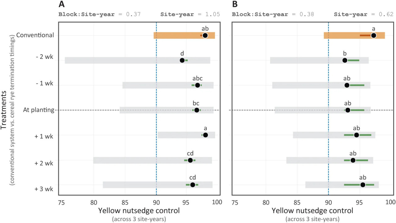 Рисунок 3 Борьба с сытью съедобной на стадии V4 кукурузы (A) и через 4 недели после стадии V4 кукурузы (B) в среде с покровной рожью, прекращенной в разные сроки, и в обычной системе кукурузы. Борьба с сорняками основана на шкале от 0 (отсутствие борьбы) до 100% (полная борьба). Светлые широкие полосы обозначают 95% доверительный интервал (CI) оценочных маржинальных средних, кружок представляет среднее значение. Неперекрывающиеся узкие сплошные полосы в пределах соответствующих CI указывают на значительно различающиеся средние значения. Кроме того, средние значения со сходными буквами не отличаются друг от друга. Случайные эффекты, оцененные на двух иерархических уровнях: блоки внутри участков (block:site) и участки (site-year), показаны вверху соответствующего рисунка.