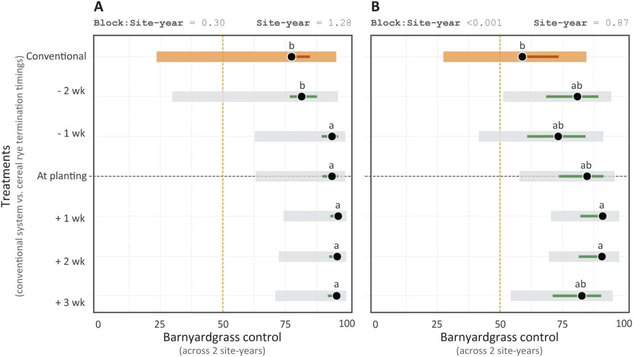 Рисунок 4 Борьба с ежовником обыкновенным на стадии V4 кукурузы (A) и через 4 недели после стадии V4 кукурузы (B) в среде с покровной рожью, прекращенной в разные сроки, и в обычной системе кукурузы. Борьба с сорняками основана на шкале от 0 (отсутствие борьбы) до 100% (полная борьба). Светлые широкие полосы обозначают 95% доверительный интервал (CI) оценочных маржинальных средних, кружок представляет среднее значение. Неперекрывающиеся узкие сплошные полосы в пределах соответствующих CI указывают на значительно различающиеся средние значения. Кроме того, средние значения со сходными буквами не отличаются друг от друга. Случайные эффекты, оцененные на двух иерархических уровнях: блоки внутри участков (block:site) и участки (site-year), показаны вверху соответствующего рисунка.