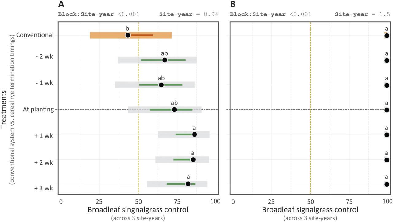 Рисунок 5 Борьба с брахиарией широколистной на стадии V4 кукурузы (A) и через 4 недели после стадии V4 кукурузы (B) в среде с покровной рожью, прекращенной в разные сроки, и в обычной системе кукурузы. Борьба с сорняками основана на шкале от 0 (отсутствие борьбы) до 100% (полная борьба). Светлые широкие полосы обозначают 95% доверительный интервал (CI) оценочных маржинальных средних, кружок представляет среднее значение. Неперекрывающиеся узкие сплошные полосы в пределах соответствующих CI указывают на значительно различающиеся средние значения. Кроме того, средние значения со сходными буквами не отличаются друг от друга. Случайные эффекты, оцененные на двух иерархических уровнях: блоки внутри участков (block:site) и участки (site-year), показаны вверху соответствующего рисунка.