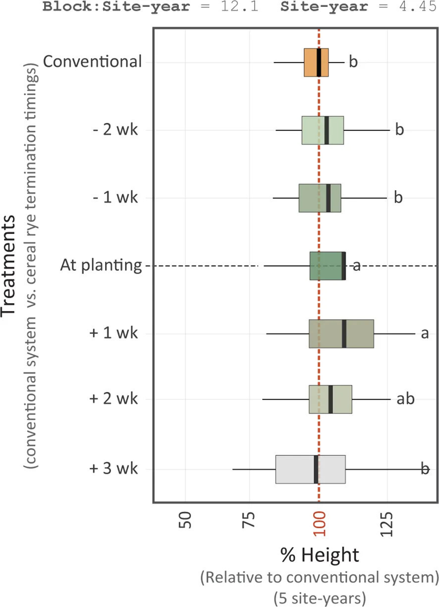 Рисунок 6 Ящичковая диаграмма, показывающая высоту кукурузы в среде с покровной рожью, прекращенной в разные сроки, по сравнению с обычной системой кукурузы. Вертикальная полоса представляет оценочное маржинальное среднее. Средние значения со сходными буквами не отличаются друг от друга. Случайные эффекты, оцененные на двух иерархических уровнях: блоки внутри участков (block:site) и участки (site), показаны вверху.