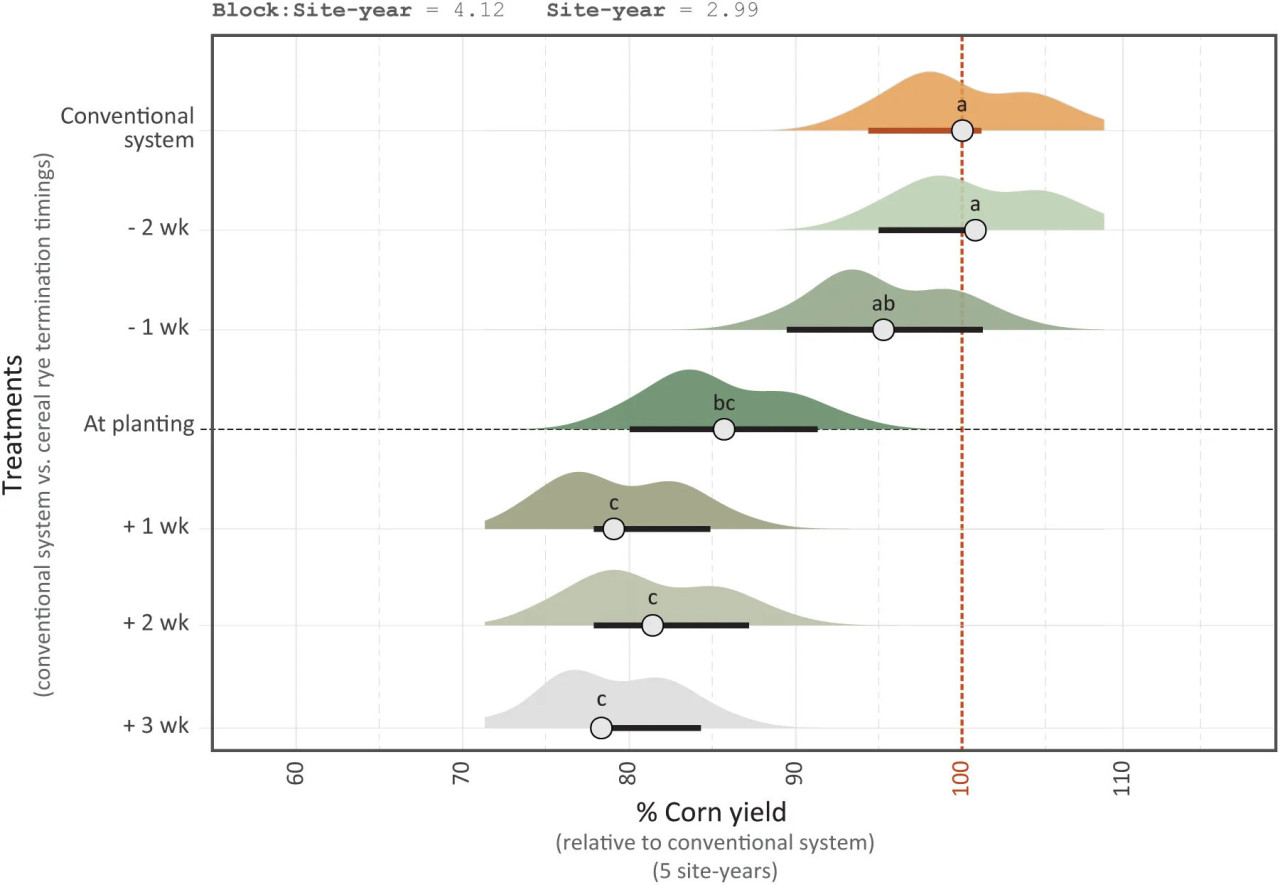 Рисунок 7 Урожайность кукурузы в среде с покровной рожью, прекращенной в разные сроки, по сравнению с обычной системой кукурузы. График плотности представляет предсказанные значения урожайности в 5 локациях-годах, кружок представляет среднее значение. Неперекрывающиеся полосы указывают на значительно различающиеся средние значения. Кроме того, средние значения со сходными буквами не отличаются друг от друга. Случайные эффекты, оцененные на двух иерархических уровнях: блоки внутри участков (block:site) и участки (site), показаны вверху.
